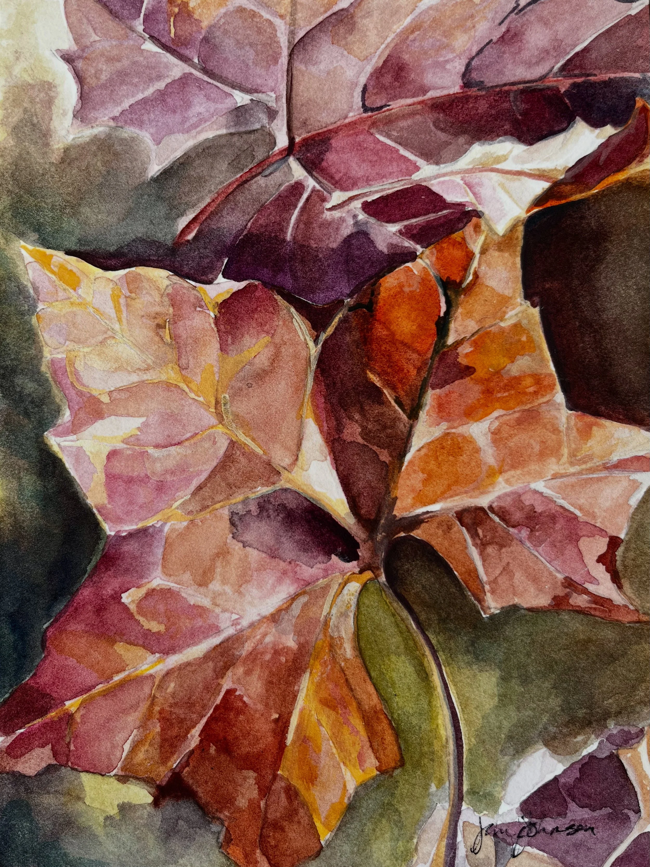 Fall(en) Leaves in the Meramec, Watercolor on Paper, 2025, 5x7". $140. Jane Johannsen View fullsize